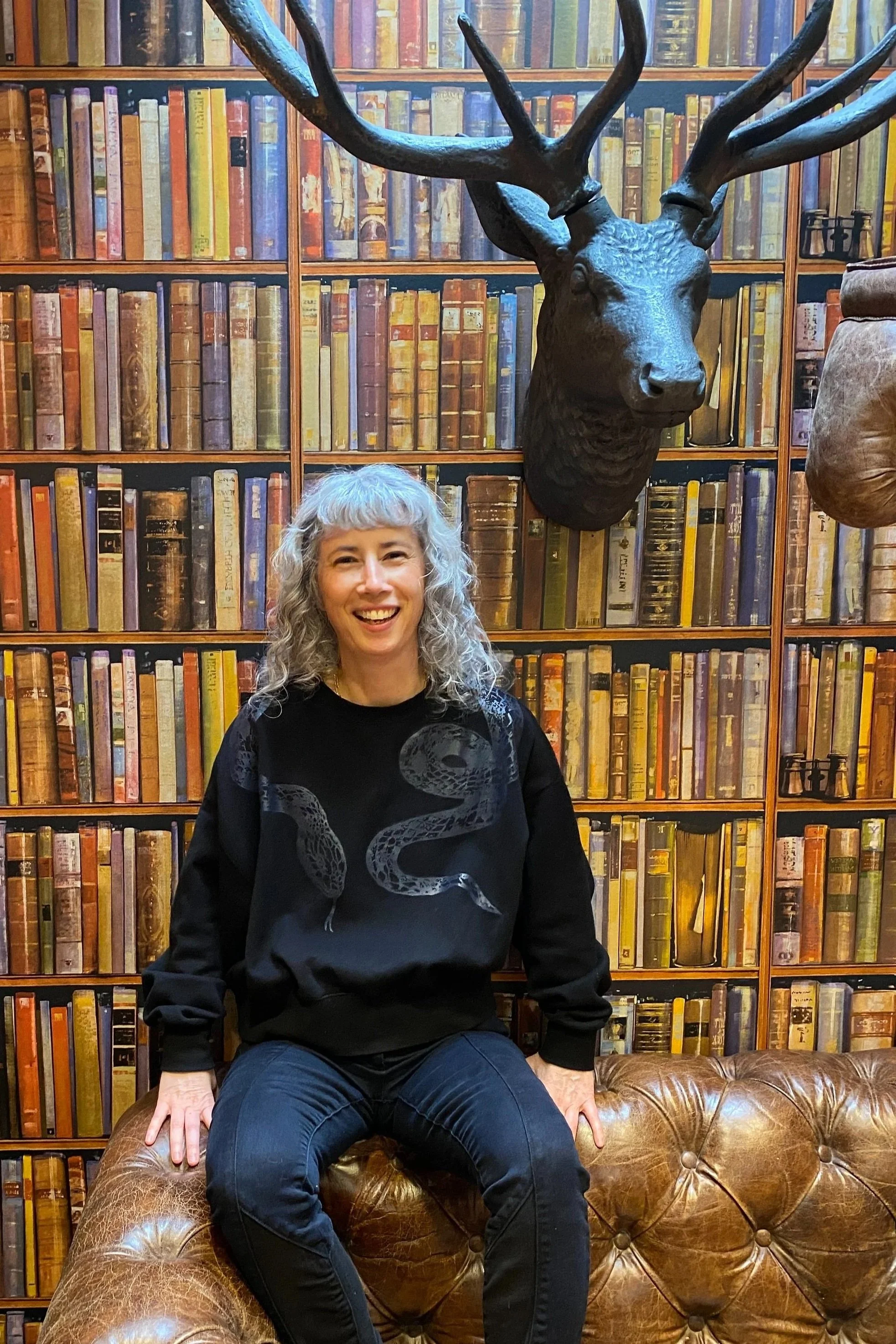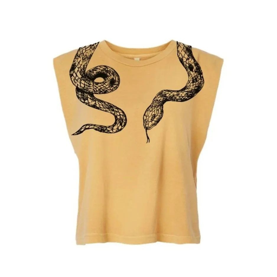 Serpentine describes the journey as much as it describes this beautiful animal. Printing continuously across the shoulders was a challenge that took time to solve. The snake was drawn by hand. The application is done by hand, with multiple transfers carefully pieced together. You will see imperfections, due to the transfer process, this is part of the beauty and uniqueness of each garment.
